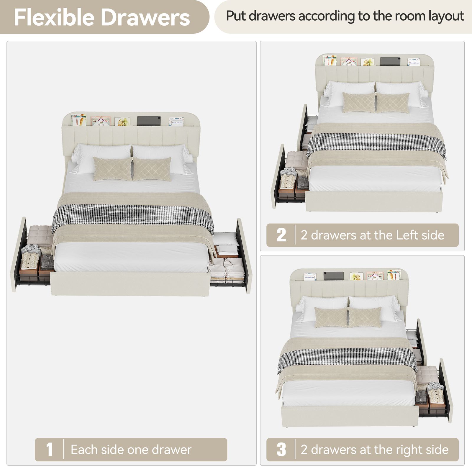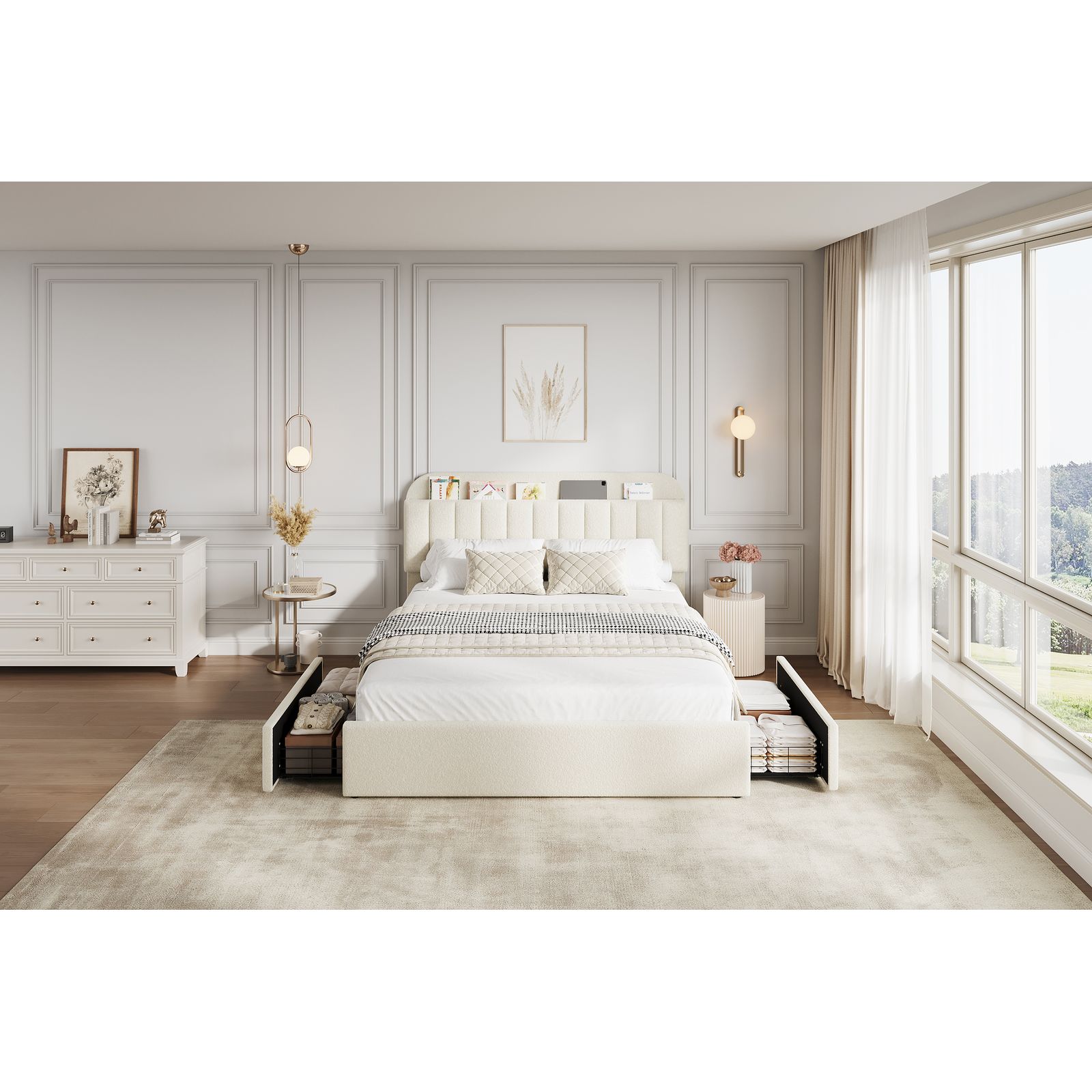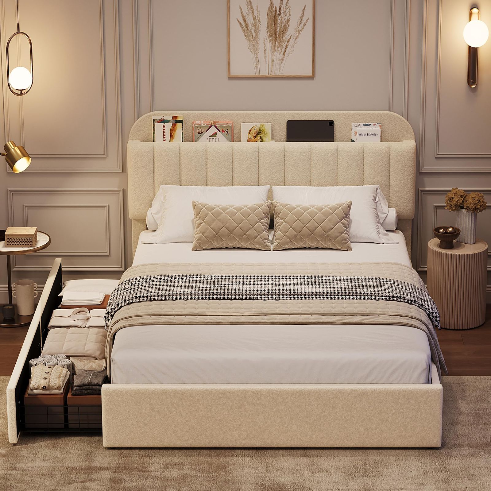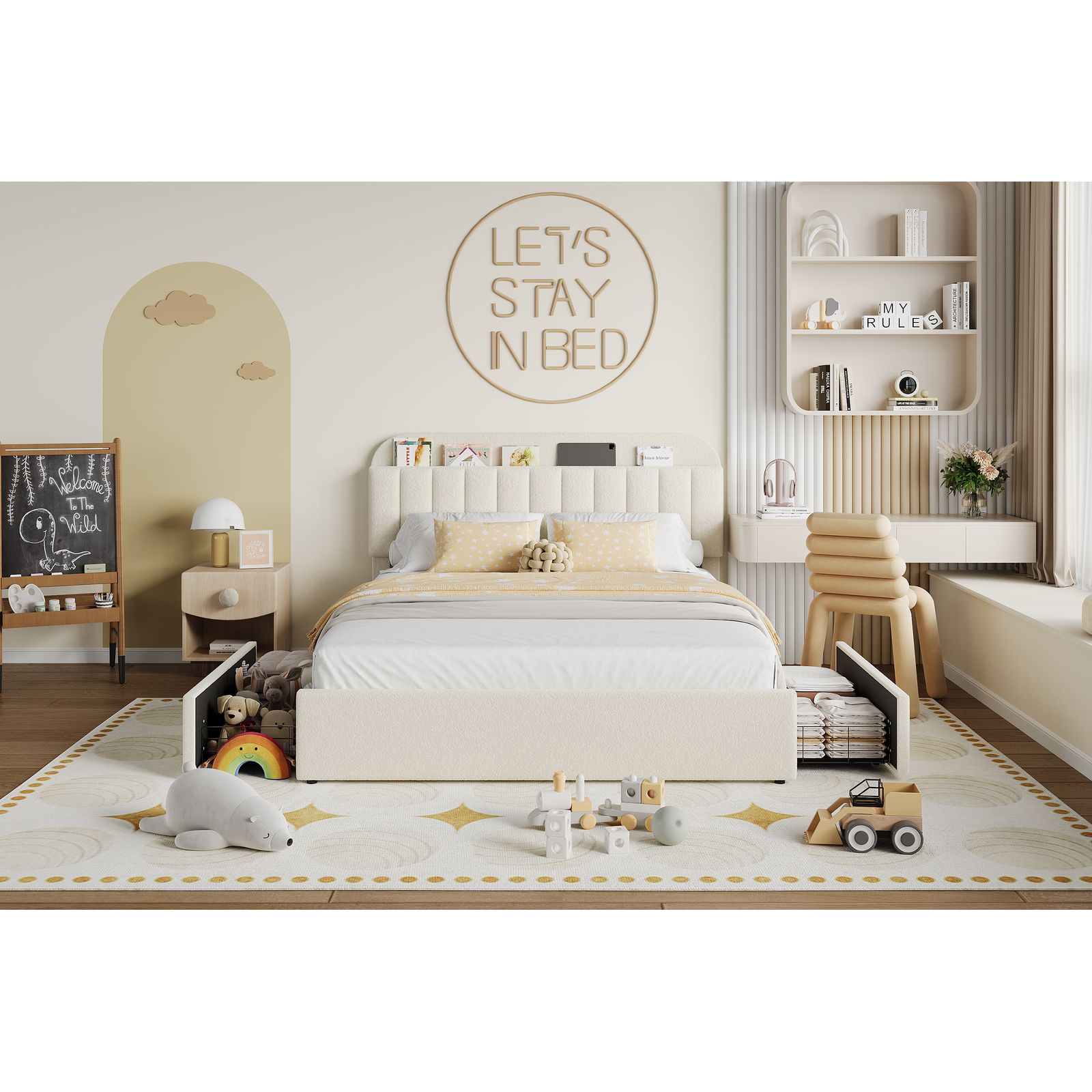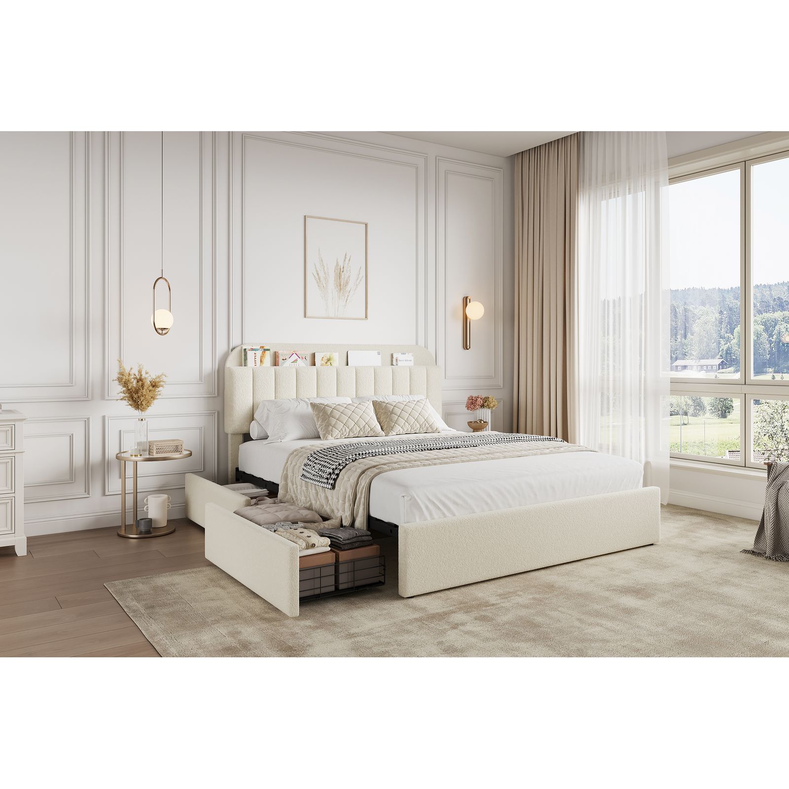 Chic Storage Bed Featuring Two Drawers, Crafted with Lambswool, an Iron Frame, And Plywood, Designed for Practicality with Built-In Storage Solutions for Bedroom Tidiness